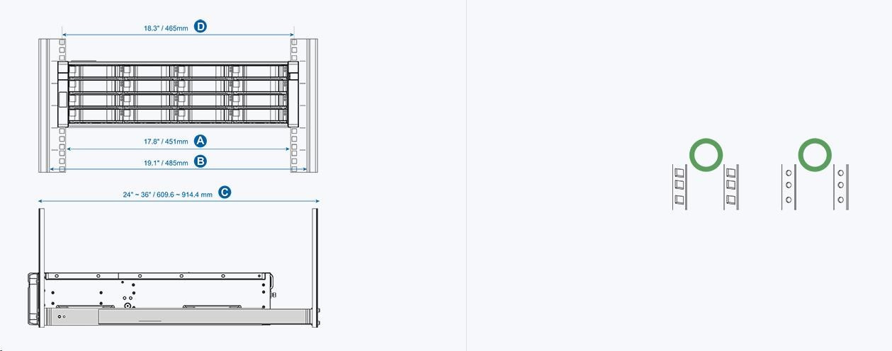- Vzdálenost mezi dvěma rackovými sloupky (měření čtvercových otvorů racku střed-střed) je 18,3"(465 mm)