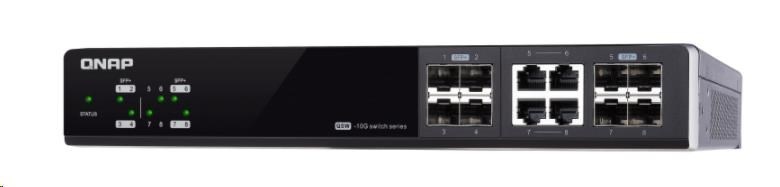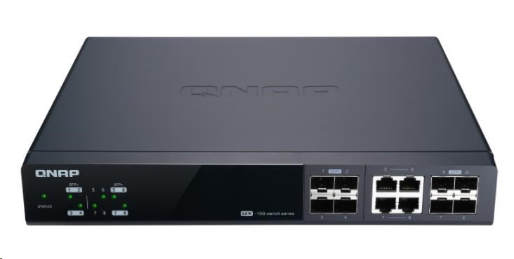 QNAP switch QSW-M804-4C (4xSFP+,4x10GbE/SFP+combo)Provedení:Desktop, Rack mounted 19"; Funkce:QoS (Quality of service), VLAN (virtual local area network), L2, Web management/Smart switch; Technologie:10 Gigabit ethernet + 10 Gigabit optika, 10 Gigabit optika; Přenosová rychlost LAN (Mb/s):10000; Počet SFP+ portů:4; Počet portů Combo:4; Ventilátor; Maximální počet portů:8; Management:Web.