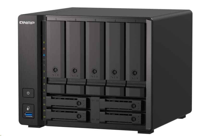 | Pozice pro diskové jednotky | 5 x 3,5" + 4 x 2,5" Systém se dodává bez HDD/SSD. Seznam kompatibilních disků HDD/SSD najdete na stránce https://www.qnap.com/compatibility/ |