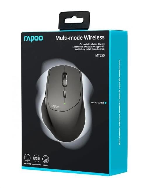 RAPOO myš MT550 Wireless Laser, Multi-mode: 2.4 GHz, Bluetooth 3.0 & 4.0, BlackRozhraní myši:Bezdrátová s USB dongle; Druh myši:Optická; Specifikace myši:4 a více tlačítek.