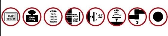 Nástěnný ocelový držák na LCD monitory a TV s uhlopříčkou 23"- 42" (58-107cm) a hmotností maximálně 20kg. 3x pant, vertikálně výklopný +20°/-20° a horizontálně otočný +90°/-90°, vzdálenost od stěny 82-392mm, materiál ocel, barva černá. Uchycení VESA: 75x75, 100x100, 100x200, 200x200..