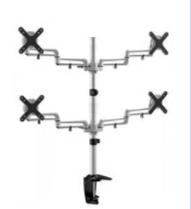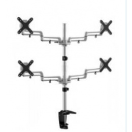 Stolní hliníkový držák s upevňovací klemou pro 4x LCD monitor a menší TV s uhlopříčkou 13"- 23" a hmotností maximálně 8kg na rameno. Uchycení VESA: 75x75, 100x100. Popis: 4x 43cm rameno - 3x pant, vertikálně výklopný +15°/-15° a horizontálně otočný 360°..