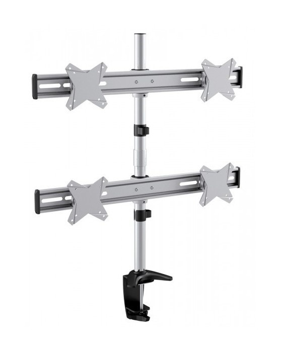 Stolní hliníkový držák s upevňovací klemou pro 4x LCD monitor a menší TV s uhlopříčkou 13"- 23" a hmotností maximálně 8kg na rameno. Uchycení VESA: 75x75, 100x100. Popis: vertikálně výklopný +15°/-15° a horizontálně otočný 360°..
