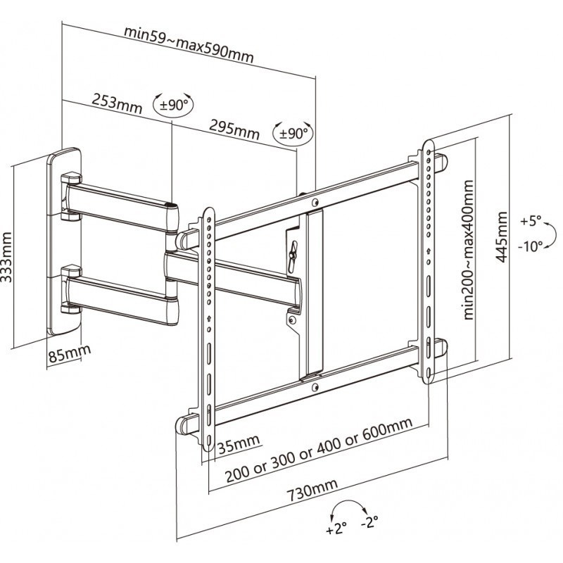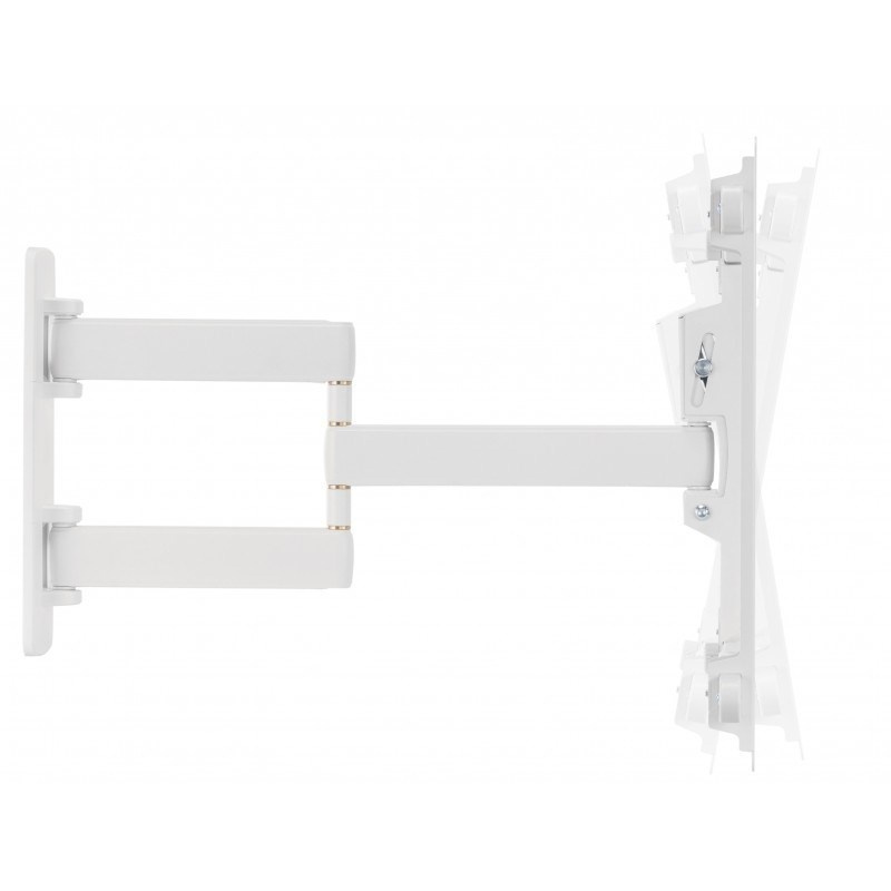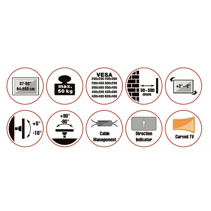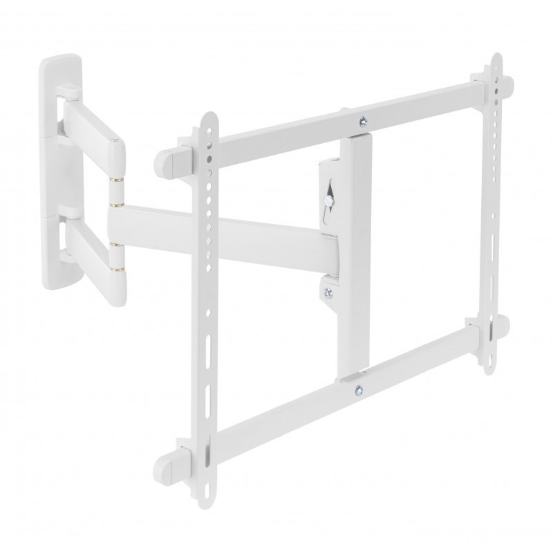 Nástěnný ocelový držák s bočním natáčením na TV s uhlopříčkou 37"- 80" (109-203cm) a hmotností maximálně 50kg. VESA max 600x400, 3x pant, vertikálně výklopný +5°/-10° a horizontálně otočný +90°/-90°, vzdálenost od stěny 59-590mm, Cable Managment, barva bílá. Uchycení VESA: 200x200, 300x200, 400x200, 300x300, 400x300, 400x400, 600x400. Direction indikátor, jemné nastavení polohy oproti fixaci ve zdi +2°/-2°, rozměry 590 x 730 x 445 mm..