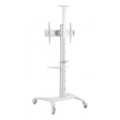 Televizní stolek na velké LCD TV s uhlopříčkou 37"- 70" (94-178cm) a hmotností maximálně 50kg. Středový nosný profil 125-160cm na kolečkách s aretací, držák výklopný +5°/-12°, horní výškově nastavitelná otočná plocha pro kameru max 5kg , polička 34x46cm max 5kg, Alu/ocel, barva bílá. Uchycení VESA: 200x200, 300x300, 400x200, 400x400, 600x400..