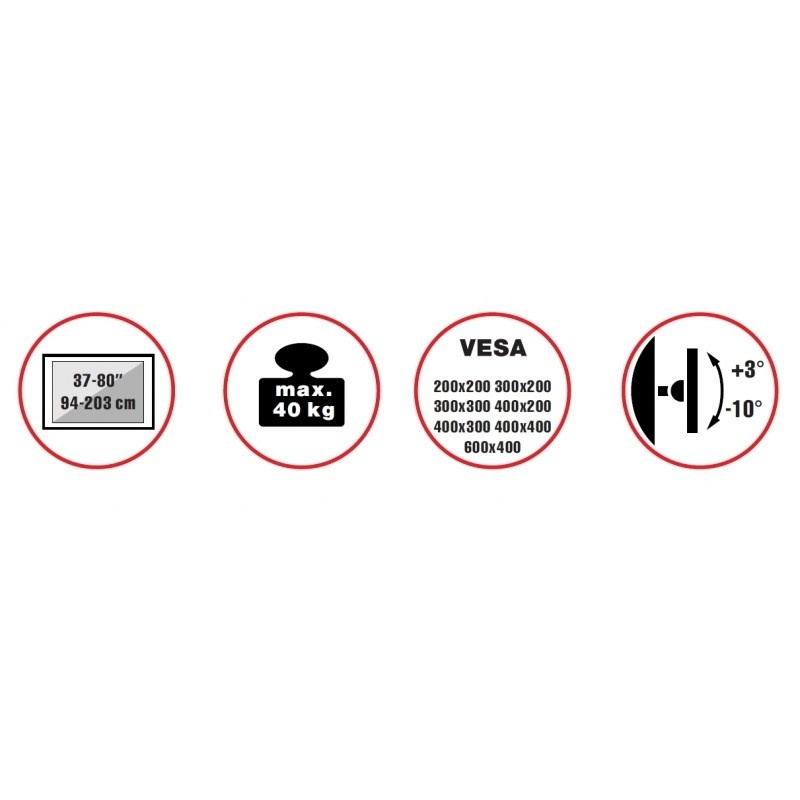 SLIM stolek s fixací ke zdi na velké TV s uhlopříčkou 37"- 80" (94-203cm) a hmotností maximálně 40kg. Středový nosný profil 106-117cm s opěrnou plochou a uchycením ke zdi, držák vertikálně výklopný +3°/-10°, Cable managment, rozměry 66x28x138cm, materiál alu/ocel, barva černá/bílá. Uchycení VESA: 200x200, 300x200, 300x300, 400x200, 400x400, 600x400..