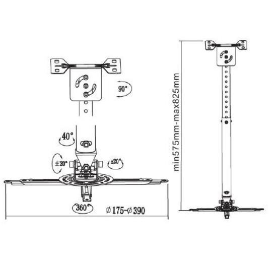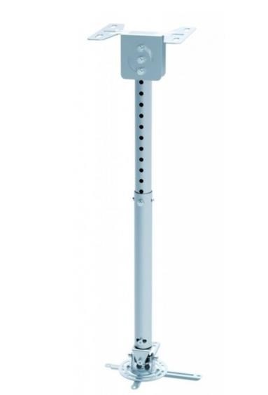 Stropní držák na dataprojektory - vzdálenost od stropu 57,5-82,5cm, přístroj lze otočit o 360° a naklonit +/-20°, maximální zatížení 20kg, možnost naklopení nosné tyče - vhodné na šikmé plochy, stříbrný. Univerzální systém uchycení dataprojektorů (rozsah 16-33 cm)..