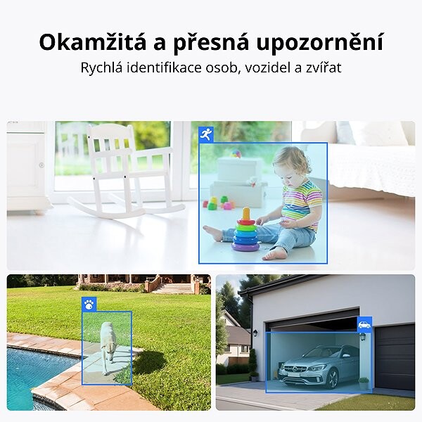 - Chytrý alarm: Podpora pokročilé detekce – PIR senzor, detekce pohybu, detekce osob, vozidel i zvířat