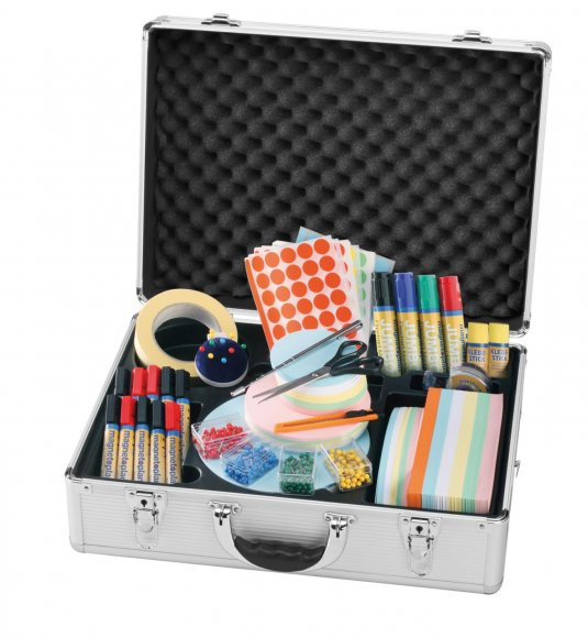 Sada pro moderátory Magnetoplan Alu kufr. Robustní hliníkový kufr se širokou škálou pomůcek pro moderátory, učitele nebo lektory. Obsahuje: 504 Komunikačních štítků 200×100mm, pravoúhlé provedení, 6 barev 200 Komunikačních štítků kulatých o průměru 100 mm, 5 barev 150 Komunikačních štítků kulatých o průměru 140 mm, 5 barev 150 Komunikačních štítků kulatých o průměru 190 mm, 5 barev 150 Komunikačních štítků oválných 190×110 mm, 5 barev 10 Popisovačů na bílé magnetické tabule nebo flipcharty (6× černý, 4× červený) 4 Popisovače Jumbo, se širokou stopou (černý, modrý, červený, zelený) 400 Připínáčků na korkové tabule (á 100 ks červený, modrý, zelený, žlutý) 1 Mechanické teleskopické ukazovátko 2 Lepidla papíru 20 g 1 Nůžky na papír (velikost 15 cm) 1 Odlamovací nůž šíře 9 mm 1 Lepící páska 25 m x 19 mm 1 Lepící maskovací páska 50 m x 30 mm 1200 Samolepky – barevné body, á 300 červená, zelená, žlutá, modrá Kufr je vybaven zámkem a řemenem pro zavěšení na rameno. Rozměry kurfru: 470×165×340 mm Hmotnost: 11 kg.