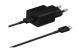 Samsung cestovní nabíječka do sítě s USB-C výstupem a maximálním výkonem 15W a USB-C nabíjecím kabelem.