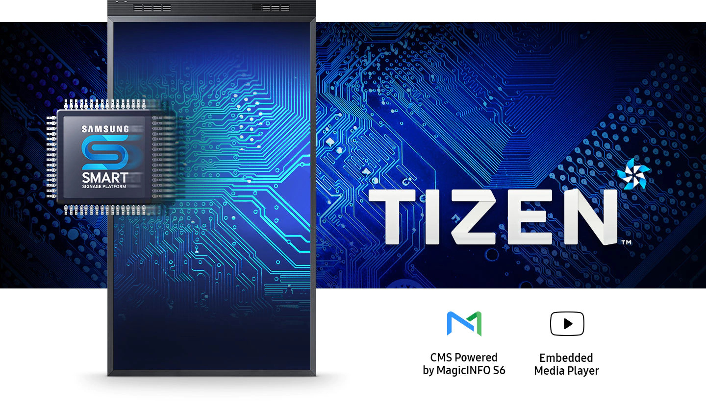 Integrovaný přehrávač MagicINFO S6 řady OMN podporovaný výkonným operačním systémem TIZEN zvyšuje celkový výkon displeje, umožňuje snadnou správu obsahu a zajišťuje bezproblémový přechod a přehrávání obsahu.