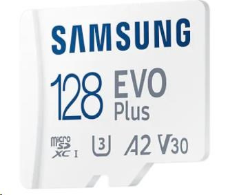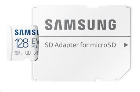 Samsung micro SDXC karta 128GB EVO Plus + SD adaptérTyp karty:SDXC; Kapacita uložiště:128 GB; Rychlost čtení min. (MB/s):160; UHS:U3; Video Class:V10.