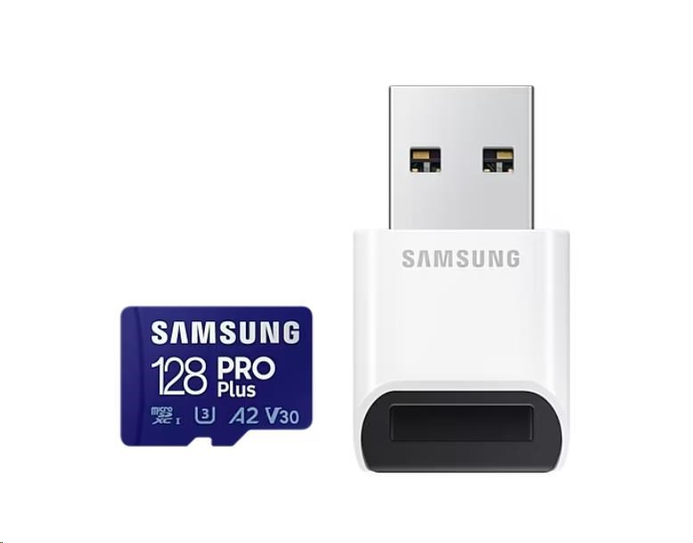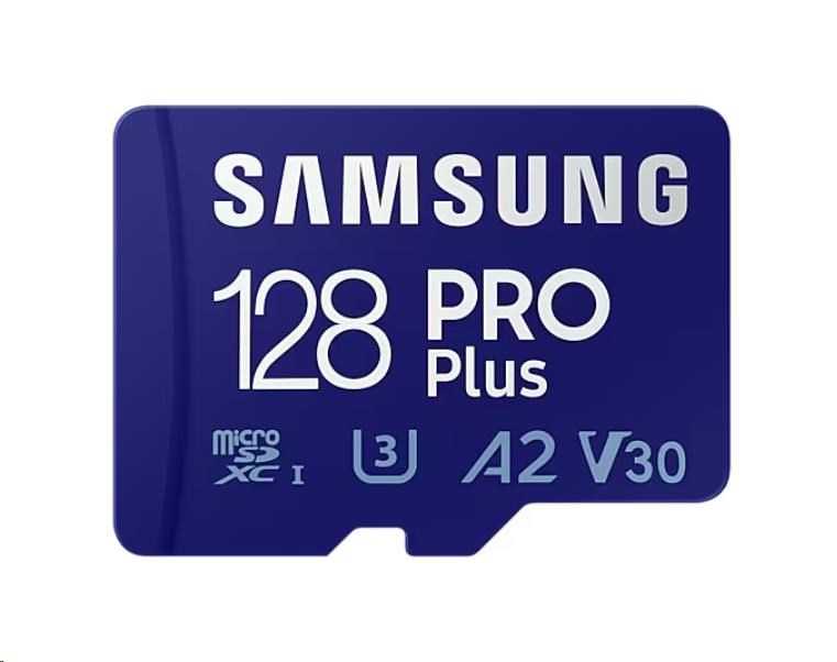 Samsung micro SDXC karta 128GB PRO Plus + USB adaptérTyp karty:Micro SDXC; Kapacita uložiště:128 GB; UHS:UHS-I; Video Class:V30; Application Performance:A2; Adaptér.