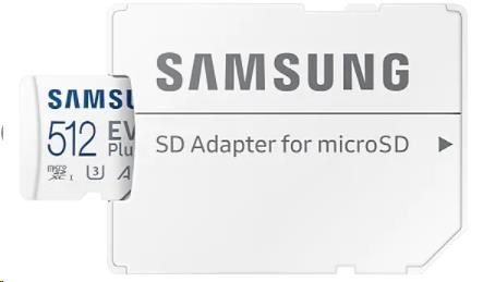 Samsung micro SDXC karta 512 GB EVO Plus + SD adaptérTyp karty:SDXC; Kapacita uložiště:512 GB; Rychlost čtení min. (MB/s):160; UHS:UHS-I; Video Class:V30.