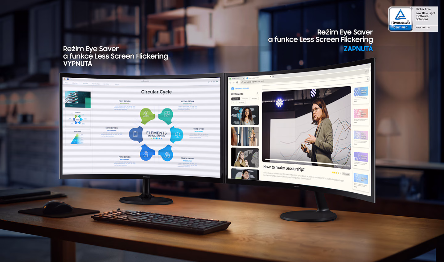 Při dlouhé práci nebo herních maratonech si už nebudeš namáhat oči. Pokročilá technologie oceněná mezinárodní certifikaci TÜV redukuje modré světlo a odstraňuje dráždivé blikání, takže je sledování obrazovky maximálně pohodlné.