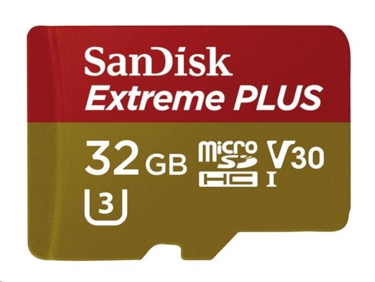 SanDisk MicroSDHC karta 32GB Extreme PLUS (10MB/s, UHS-I V30, Rescue Pro Deluxe) + adaptérTyp karty:Micro SDHC; Kapacita uložiště:32 GB.