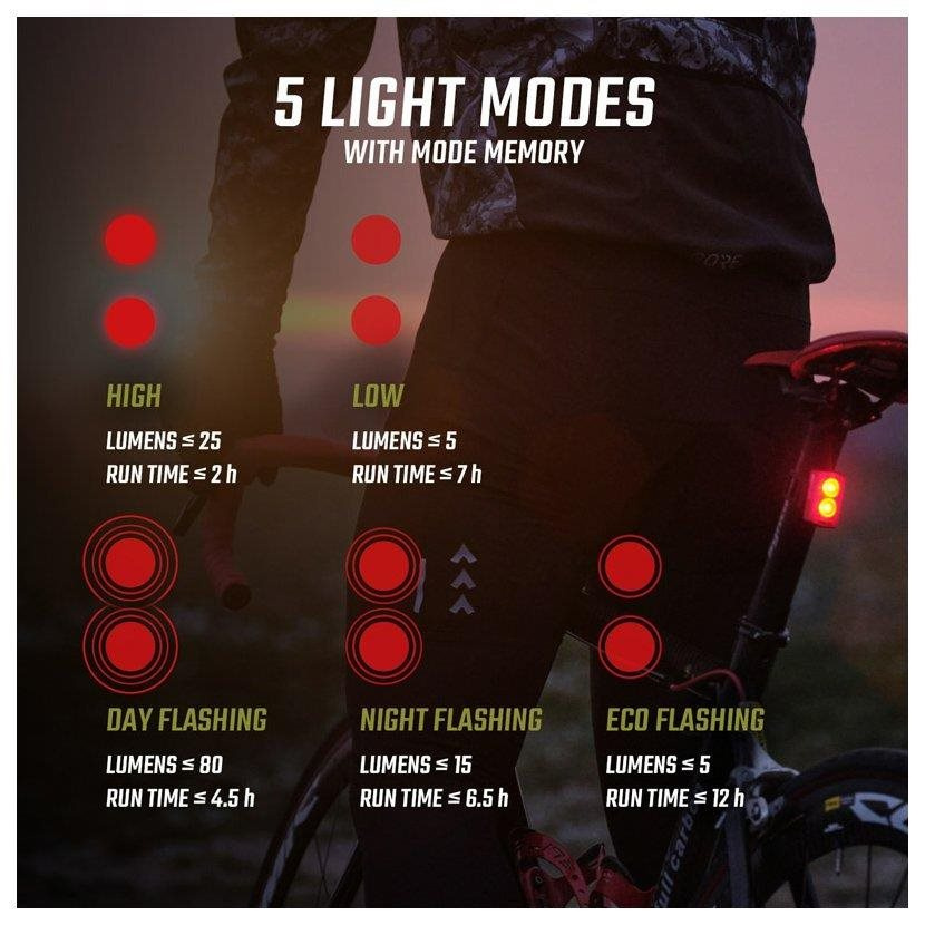 S Buster RL 80 máte na výběr z pěti světelných režimů, pomocí kterých můžete individuálně nastavit intenzitu osvětlení a dobu výdrže baterie. V režimu High dosahuje světlo Buster RL 80 světelného výkonu 25 lumenů po dobu až 2 hodin, v režimu Low svítí až 7 hodin při světelném výkonu 5 lumenů. Režim Day Flash dokáže pomocí dvou červených blikajících LED upozorňovat na cyklistu po dobu 4,5 hodin se světelným výkonem 80 lumenů. V režimu Night Flashing bliká zadní světlo až 6,5 hodiny při světleném výkonu 15 lumenů. Pokud jízda trvá déle, dokáže zajišťovat viditelnost v silničním provozu režim Eco Flash až po dobu 12 hodin.