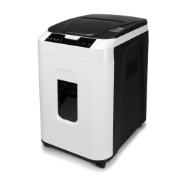 Automatický skartovací stroj atraktivního designu s kapacitou zásobníku na 180 listů pro střední kanceláře. Vhodný pro skartaci dokumentů o šířce 220 mm. Stroj je standardně vybaven automatickým systémem start/stop, zpětným chodem, tepelnou pojistkou motoru proti přehřátí, signalizací přeplněného koše. Příležitostně lze skartovat sešívací sponky a kreditní karty. Šíře vstupu: 220 mm Velikost řezu: 2 x 12 mm Kapacita při manuálním vložení, papír DIN A4, 70 g/m2: 10 Kapacita automatického zásobníku: 180 listů Stupeň utajení dle nové DIN 66399: P-5 Řezný mechanismus skartuje CD, kreditní karty a sponky: ne Rychlost: 0,05 m/s Velikost koše: 32,2 litrů Hlučnost motoru: < 55 dB Připojovací parametry, Watt / Volt/Hz ( střídavý proud ): 500 W /230 / 50 / 1~ Délka nepřetržité skartace: 60 min Tepelná pojistka motoru proti přehřátí: dvojitá Automatický start/stop: ano Aut. zpětný chod / aut. vypnutí při ucpaném koši: ano Elektronické zabezpečení dveří: elektronické s LED kontrolkou Pojezdová kolečka: ano Rozměry, mm ( v x š x h ): 555 x 365 x 265 Hmotnost: 16,1 kg.