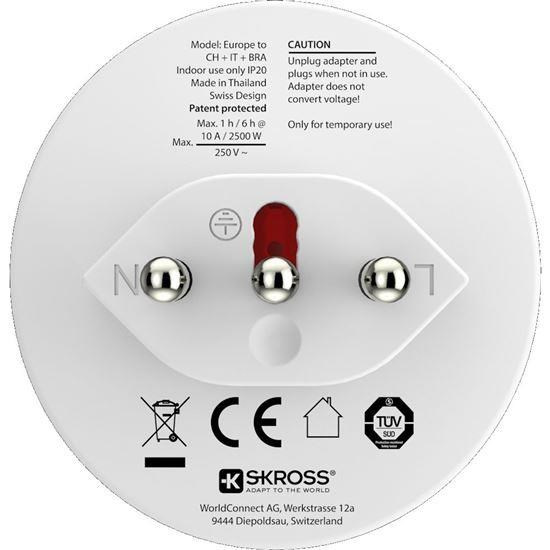 SKROSS cestovní adaptér pro použití v Brazílii, Itálii a Švýcarsku, typ J/N/LCestovní adaptér s uzemněním, max. 10A, pro obyvatele Evropy navštěvující Brazílii, Itálii nebo Švýcarsko, patentovaný mechanismus pohyblivého uzemňovacího kolíku, jeden adaptér umožňuje připojení v 15 zemích světa, Schuko uzemnění zásuvky - funkční pro univerzální vidlice.