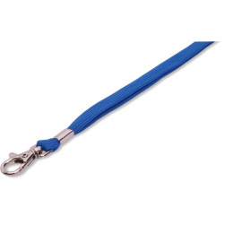 Dutá šňůrka s karabinkou modré barvy. Šířka sňůrky 12 mm, délka 90 cm..
