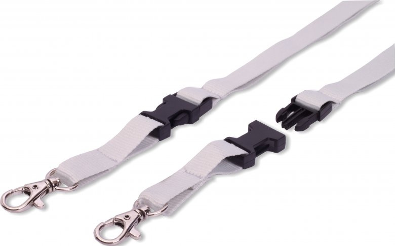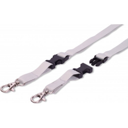 Plochá šňůrka s karabinkou šedé barvy. Šířka sňůrky 20 mm, délka 90 cm..