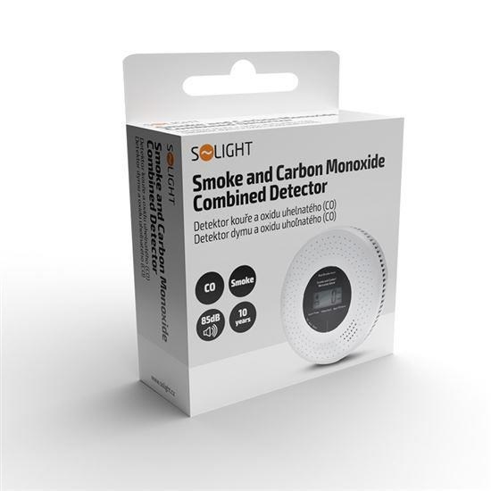 Solight detektor kouře a oxidu uhelnatého, LCD displej, 2x AA baterieKombinovaný detektor kouře a oxidu uhelnatého, fotoelektrický senzor kouře a elektrochemický senzor oxidu uhelnatého, mimořádně dlouhá životnost, nízká spotřeba, napájení: 2*1,5V AA baterie, citlivost senzoru oxidu uhelnatého: 50/100/300ppm, citlivost senzoru kouře: 0,25 db/m, klidový proud: do 50uA.
