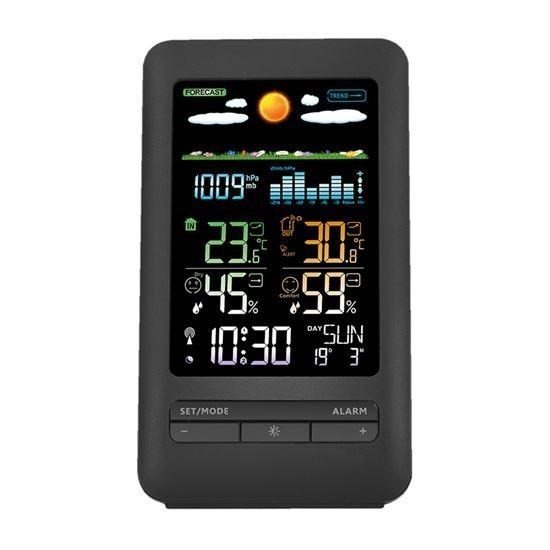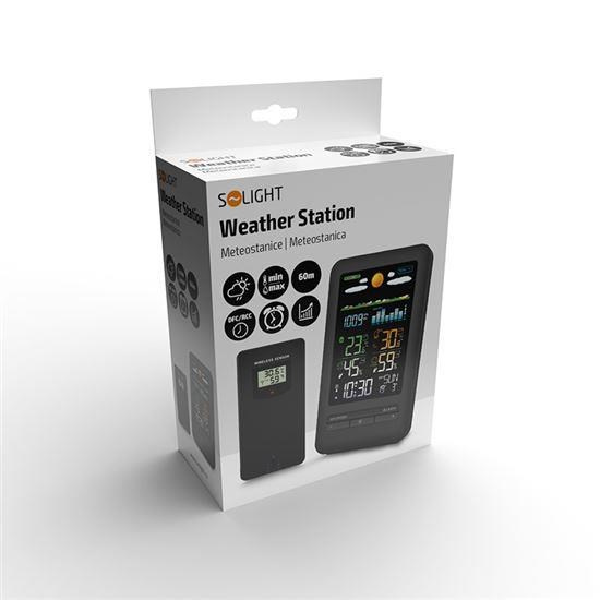 Solight meteostanice, barevný LCD, vnitřní/venkovní teplota a vlhkost, tlak, RCC, černáDCF - Rádiově řízené hodiny, upozornění na zvolenou venkovní teplotu a možnost námrazy, zobrazení maximální a minimální vlhkosti/teploty vzduchu, bezdrátový venkovní senzor: součástí balení je jeden bezdrátový senzor, frekvence vysílače 433,92MHz, dosah cca 60m v otevřeném prostoru, funkce předpovědi počasí, zobrazení dnů v týdnu v jazycích: CZ, EN, DE, HU, formát času 12/24h.