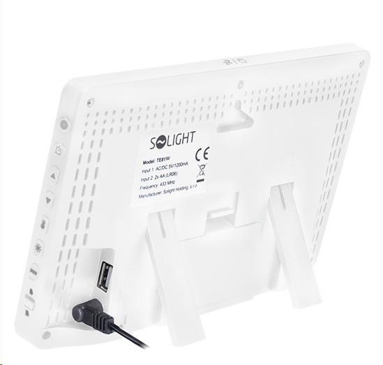 Solight TE81W meteostanice, extra velký barevný LCD, teplota, vlhkost, tlak, RCC, USB nabíjení, bíláNapájení:Síťový zdroj + Baterie; Funkce Meteostanic a teploměrů:Hodiny.