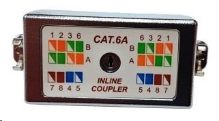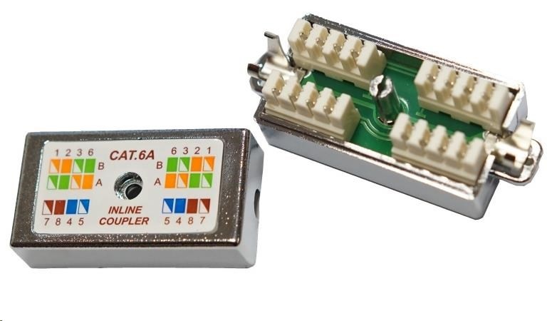 Propojovací box Cat6A, stíněný pokovením. Umožňuje propojit kabelové segmenty beze ztráty kvality vedení. Narážecí kontakty.