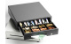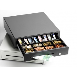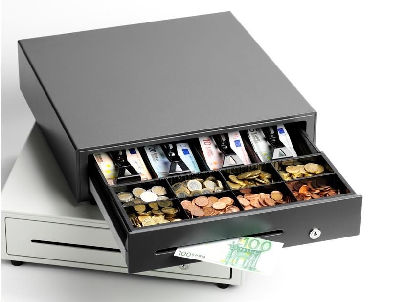 cash drawer, front opening, dimensions (WxHxD): 410x114x415mm, insert: 4 note compartments (horizontal), 8 coin compartments, 1 receipt compartment, 3-pos. lock, direct printer připojovací, colour: dark grey.