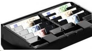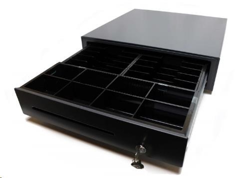 cash drawer, front opening, dimensions (WxHxD): 410x114x415mm, 8 note compartments (vertical), 8 coin compartments, 1 receipt compartment, 3-pos. lock, direct printer připojovací, colour: dark grey.