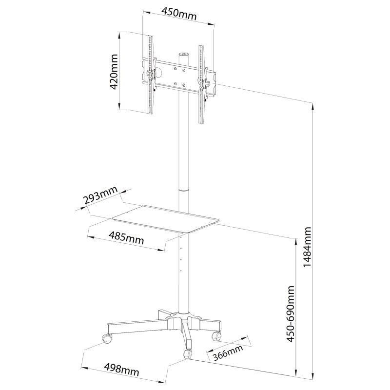 Stojan na televize Ergosolid Falco 24Stojan na televize i monitory 23-55", VESA 75x75 až 400x400, nastavení výšky 1000-1484mm, naklápění +/-15°, polička 485x293mm, kolečka s aretací, vedení kabelů, nosnost 25kg.