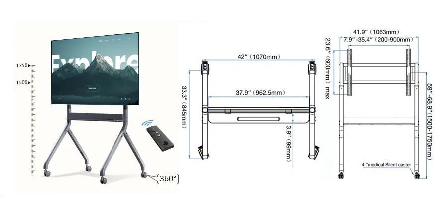 Stojan na televize NB P220Podlahový stojan na Tv, multimediální tabule, monitory a dotykové displeje 60" - 100", elektrické nastavení výšky 1500-1750 mm, dolní polička 962x99 mm s ovládacím panelem + DO, kolečka 75mm s aretací, VESA 200x200 až 900x600, nosnost 90,9kg, barva grafit.