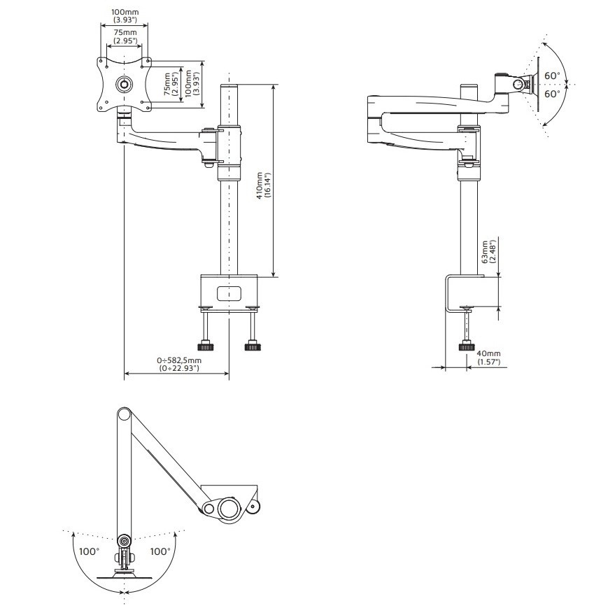 Stolní držák monitoru Edbak DM101Profesionální stolní držák na monitory 17-27", výsuvný 0-700mm , otočný +/-360°, sklopný +/-60°, výškové polohování 100-400mm , pivot +/-360°, VESA 75x75 a 100x100, nosnost 10kg.