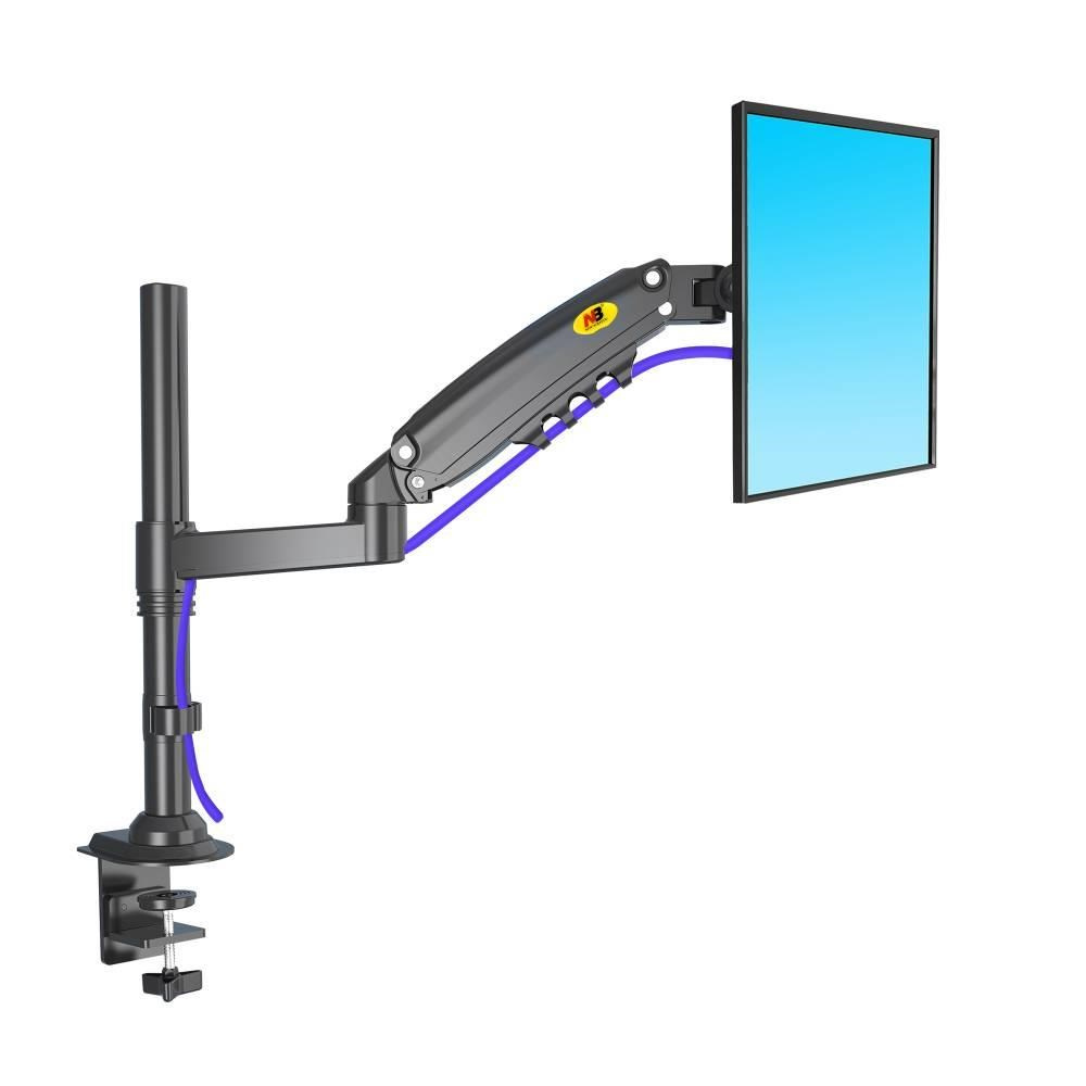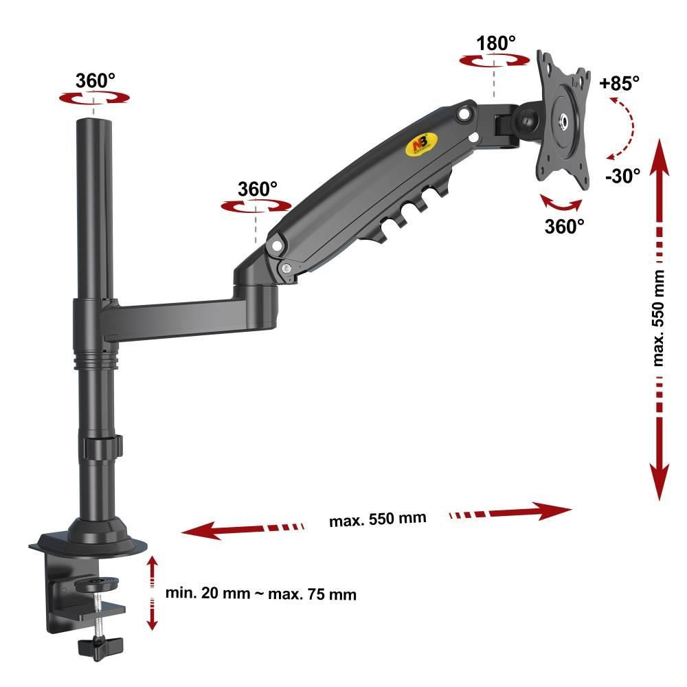 Stolní držák monitoru NB H80BDržák na monitory 17-27", uchycení na hranu stolu nebo do prostoru, otáčení do stran +/-180°, náklon +80/-35°, pivot, vedení kabeláže, VESA 75x75 a 100x100, nosnost 9kg.