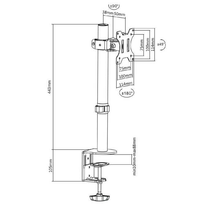 Stolní držák na monitor Fiber Mounts M7C51Kvalitní stolní držák na monitory a Tv 13-32", nastavení výšky 100-420mm, otáčení do stran +/-90°, naklápění až +/- 45°, 2 typy stolních úchytů, VESA 75x75 a 100x100, nosnost 8kg.