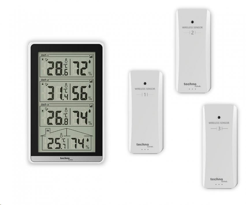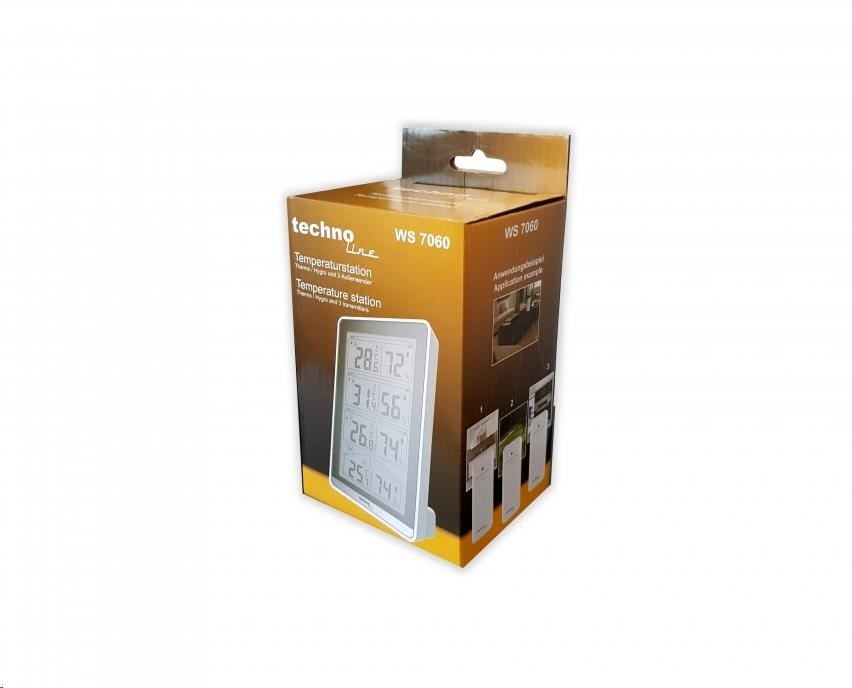 TechnoLine WS 7060 - digitální teploměr s vlhkoměrem se třemi bezdrátovými čidlyLCD displej o rozměrech 62 x 110 mm, velikost číslic na displeji – vnitřní teplota a relativní vlhkost 12 mm, vnější teplota a relativní vlhkost 15 mm, měření vnitřní teploty a relativní vlhkosti, měření vnější teploty a relativní vlhkosti 3 bezdrátovými čidly, zobrazení všech naměřených hodnot na displeji najednou, alarm horní a dolní nastavitelné meze vnější teploty.