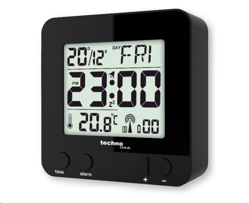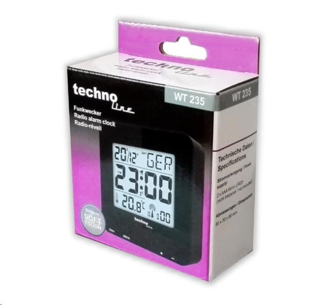 TechnoLine WT 235BK digitální budík, černáDisplej o rozměrech 53 x 44 mm, velikost číslic čas 17 mm, datum, zkratka názvu dne, teplota 9 mm, možnost krátkodobého podsvícení displeje na 5 sekund modrým světlem, čas řízený rádiovým signálem DCF-77 s možností manuálního nastavení, ikona příjmu signálu DCF-77.