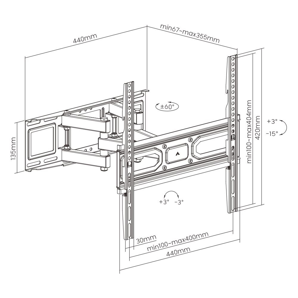 Televizní držák Fiber Mounts FM79Držák na Tv 30-70", VESA 100x100 až 400x400, otáčení do stran +/-60°, naklápění +3°/-15°, korekce roviny +/-3°, vzdálenost Tv od zdi 67-355mm, pevná a spolehlivá konstrukce s nosností 40kg.