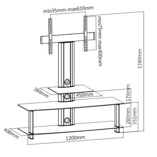 Televizní stolek Fiber Mounts M6C26Televizní stolek včetně držáku Tv 37-60", materiál hliník a tvrzené sklo, 2 police 1200x400, horní polička 450x380mm, vedení kabeláže, výška 1180mm, VESA 100x100 až 600x400, nosnost 40kg.