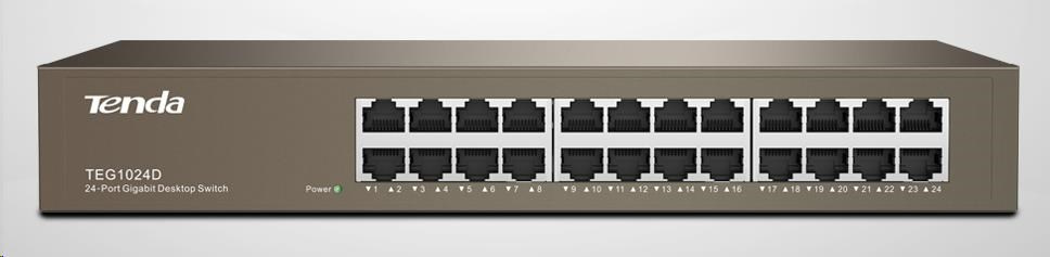 Tenda TEG1024D 24-port Gigabit Ethernet Switch, 10/100/1000 Mbps, fanless, rackmountProvedení:Rack mounted 19"; Funkce:L2; Technologie:Gigabit Ethernet 1000Mbps; Počet portů LAN:24; Přenosová rychlost LAN (Mb/s):1000; Počet PoE Out portů:0; Počet SFP portů:0; Počet SFP+ portů:0; Počet portů Combo:0; Počet portů SFP28:0; Počet portů QSFP28:0; Počet portů QSFP+:0; Přenosová rychlost LAN (Mb/s):0; Maximální počet portů:24.