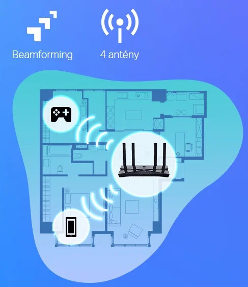 Čtyři vysoce výkonné externí antény posilují Wi-Fi signál v celém domě. Technologie tvarování vyzářeného paprsku detekuje zařízení a soustředí intenzitu signálu bezdrátové sítě jejich směrem, a to zejména do míst, která byla dříve hůře dosažitelná.