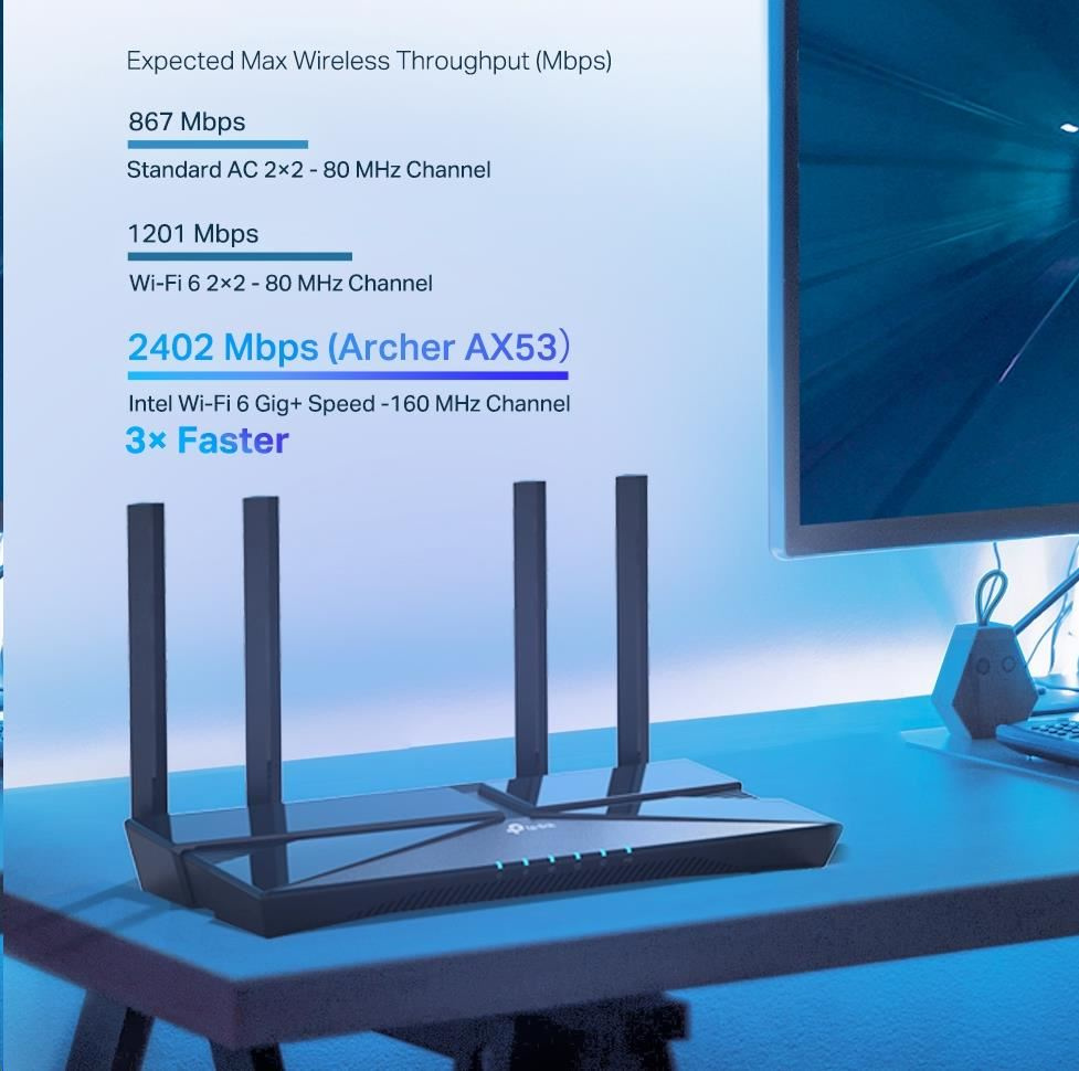 Wi-Fi router TP-Link Archer AX53 se výborně hodí pro nerušené brouzdání po internetu, ale také náročnější hraní online her nebo streamování videa ve vysoké kvalitě. Využívá nejmodernější technologii Wi-Fi 6 a pracuje ve dvou pásmech, takže dokáže zajistit rychlosti až 574 + 2 402 Mbit/s. Hráče potěší až o 75 % nižší latence, která zajistí nerušené hraní bez zpožďování nebo zamrzání internetu. Čtyři externí antény se postarají o dokonalé pokrytí prostoru, a to i v případě, že žijete v domácnosti s více patry. Přenos dat je vždy bezpečný díky pokročilému šifrování. Pro ještě snazší a intuitivnější ovládání využijte hlasovou asistentku Alexu.