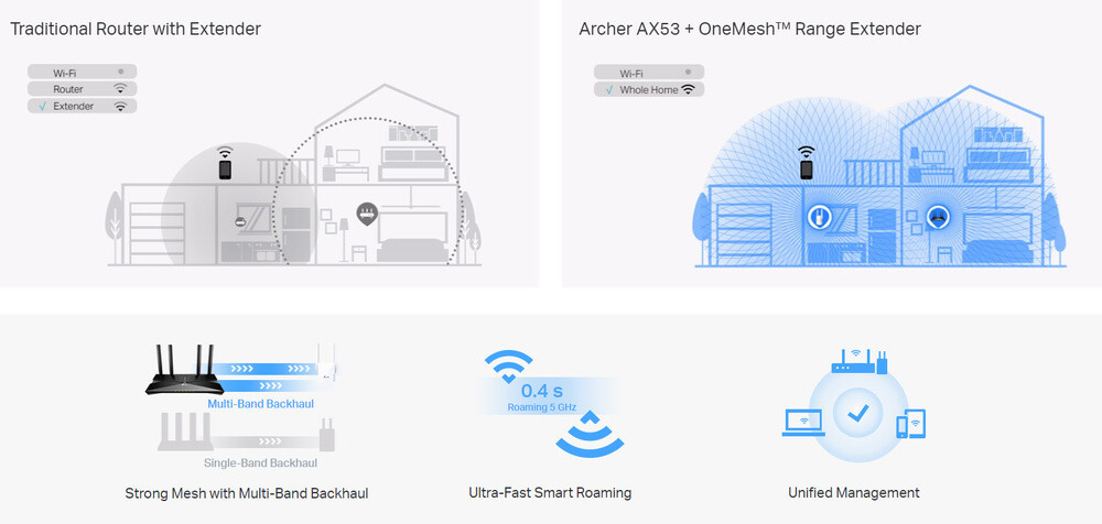 Router Archer AX53 je plně kompatibilní s technologií OneMesh, která vám umožní bezproblémové pokrytí celé domácnosti. Zvyšuje sílu signálu a zachová název sítě, čímž pokryje každý kout vaší domácnosti. Výhodou je navíc snadná centralizovaná správa centrálního uzlu pomocí intuitivní aplikace.