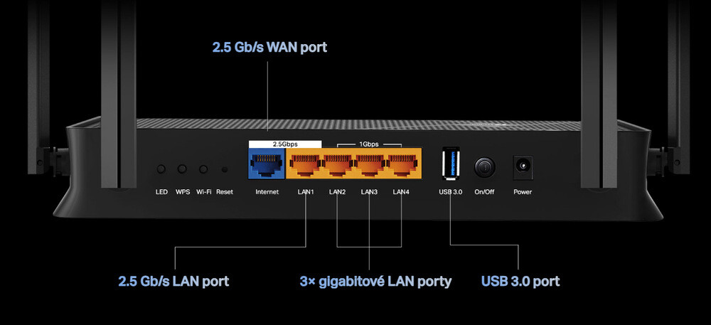 - Špičkové kabelové připojení – viz 2,5 Gb/s WAN port a 2,5 Gb/s LAN port
