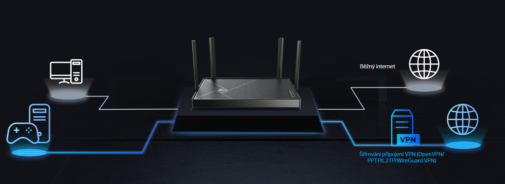 Výhodou je i to, že router umožňuje zařízením v domácí síti přístup ke vzdáleným serverům VPN, aniž byste museli instalovat software VPN do každého zařízení zvlášť. Dokáže přitom současně provozovat běžné připojení k internetu i VPN pro maximální bezpečnost a flexibilitu připojení.