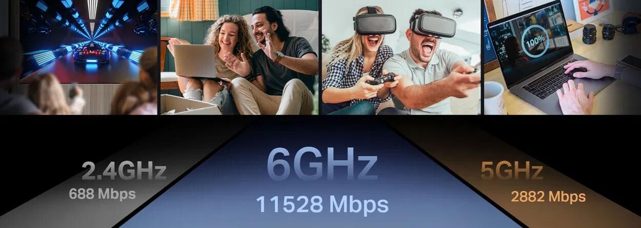 - Dokáže současně přenášet data v pásmech 6 GHz, 5 GHz i 2,4 GHz