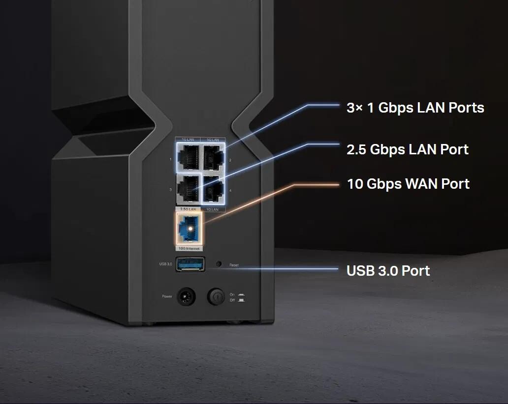 WiFi router TP-Link Archer BE700 je vybaven 10G WAN portem pro připojení optických zařízení. Kromě toho nabízí jeden 2,5G LAN port, tři 1G porty a jedním USB portem (3.0), což z něj dělá ideální řešení pro budoucí potřeby vaší domácí sítě. S touto výbavou budete připraveni na náročné úkoly, jako je práce s NAS servery, streamování ve vysokém rozlišení nebo rychlý přenos dat.