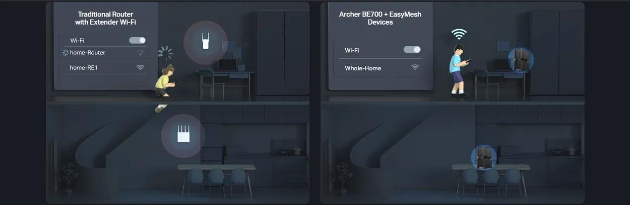 S WiFi routerem TP-Link Archer BE700 můžete zapomenout na slabý signál nebo výpadky připojení. Díky podpoře technologie EasyMesh snadno vytvoříte jednotnou síť pro celý domov s jedním WiFi jménem a heslem. Ať už připojujete další EasyMesh zařízení od stejného nebo jiného výrobce, síť se automaticky rozšíří tam, kde ji potřebujete.