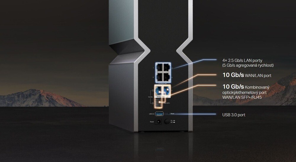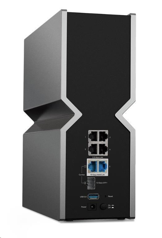 - 2 porty 10 Gbit/s WAN/LAN (1× kombinovaný optický/Ethernet), 4 porty 2,5 Gbit/s LAN a 1× USB 3.0
